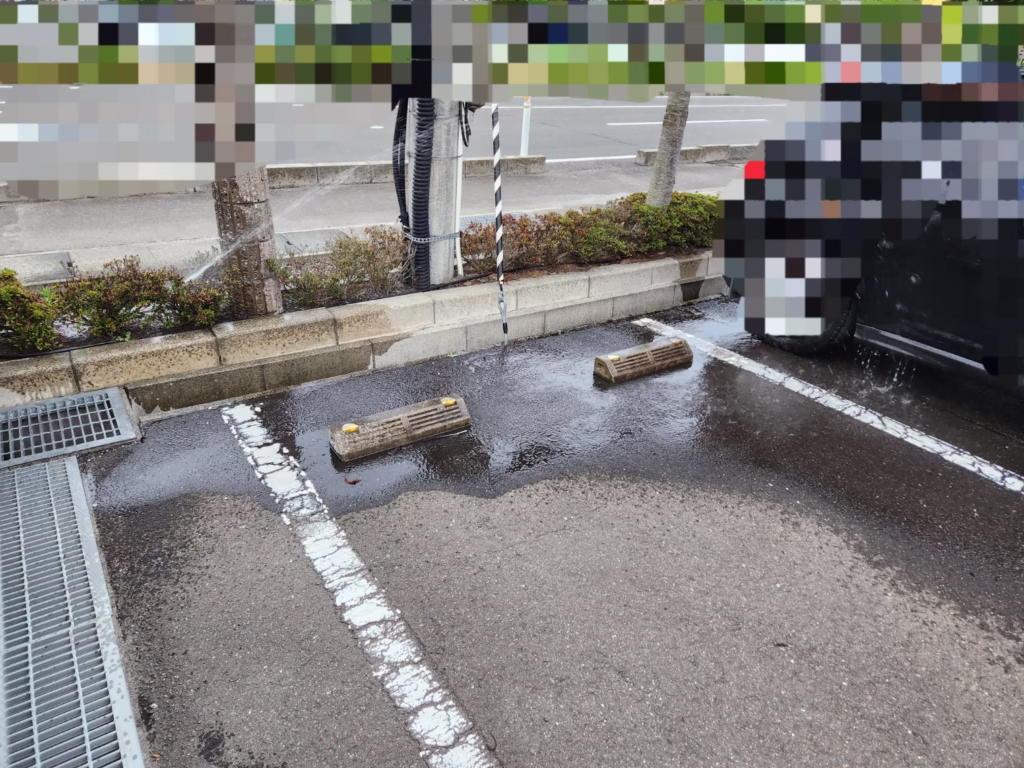 謎に花壇から噴き出す水。。しかも運転席にもあたってますがな。